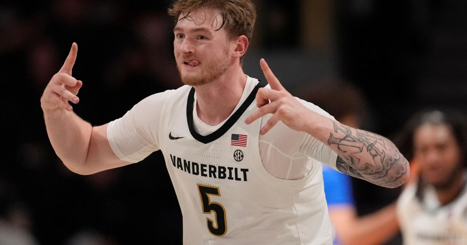 Vanderbilt forward Tyler Nickel (5) celebrates a three point basket during the first half of an NCAA college basketball game against Kentucky, Tuesday, Jan. 27, 2026, in Nashville, Tenn.