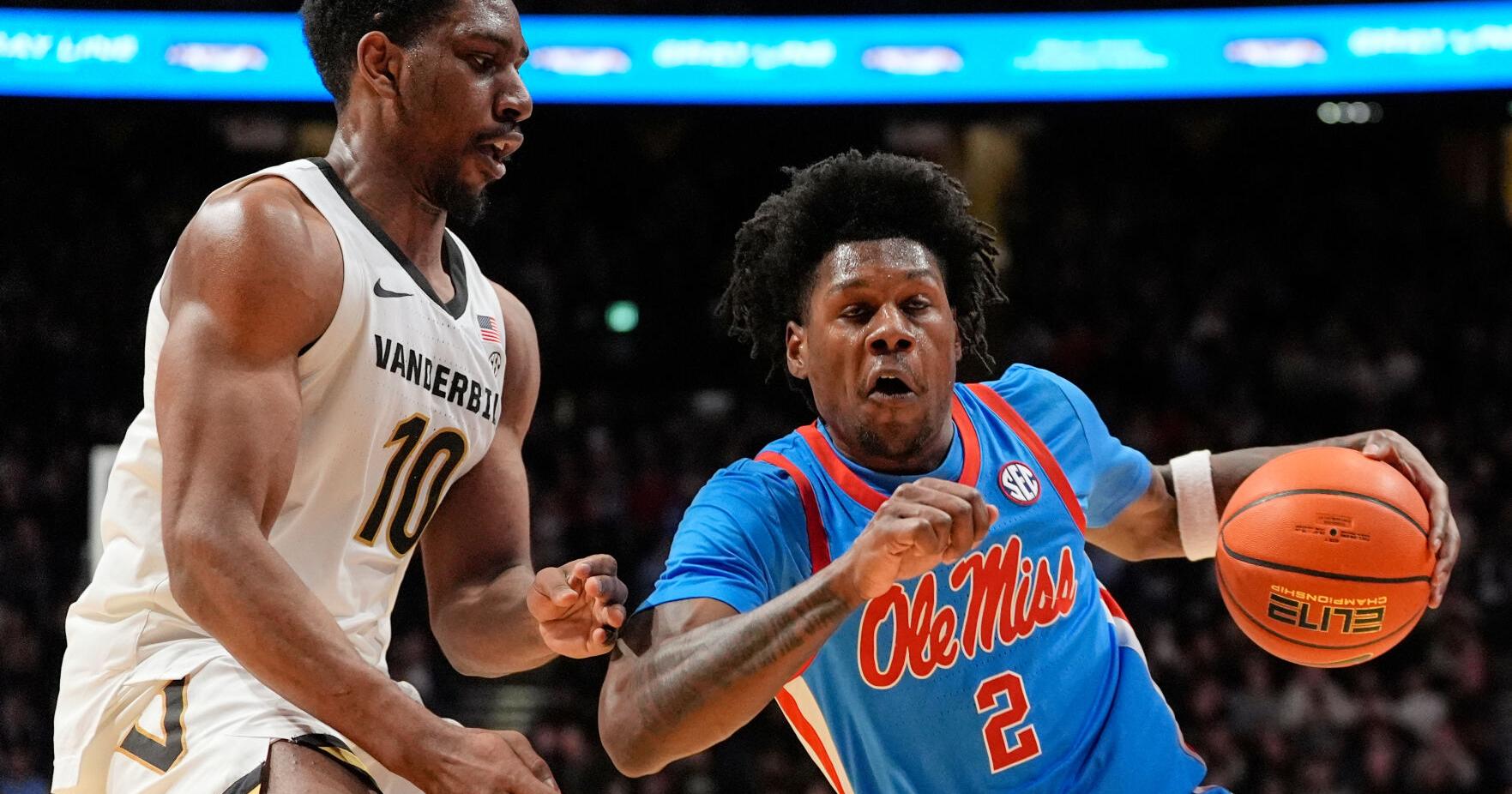 Ole Miss guard AJ Storr dribbles the ball past Vanderbilt forward AK Okereke during the first half of Saturday’s game.