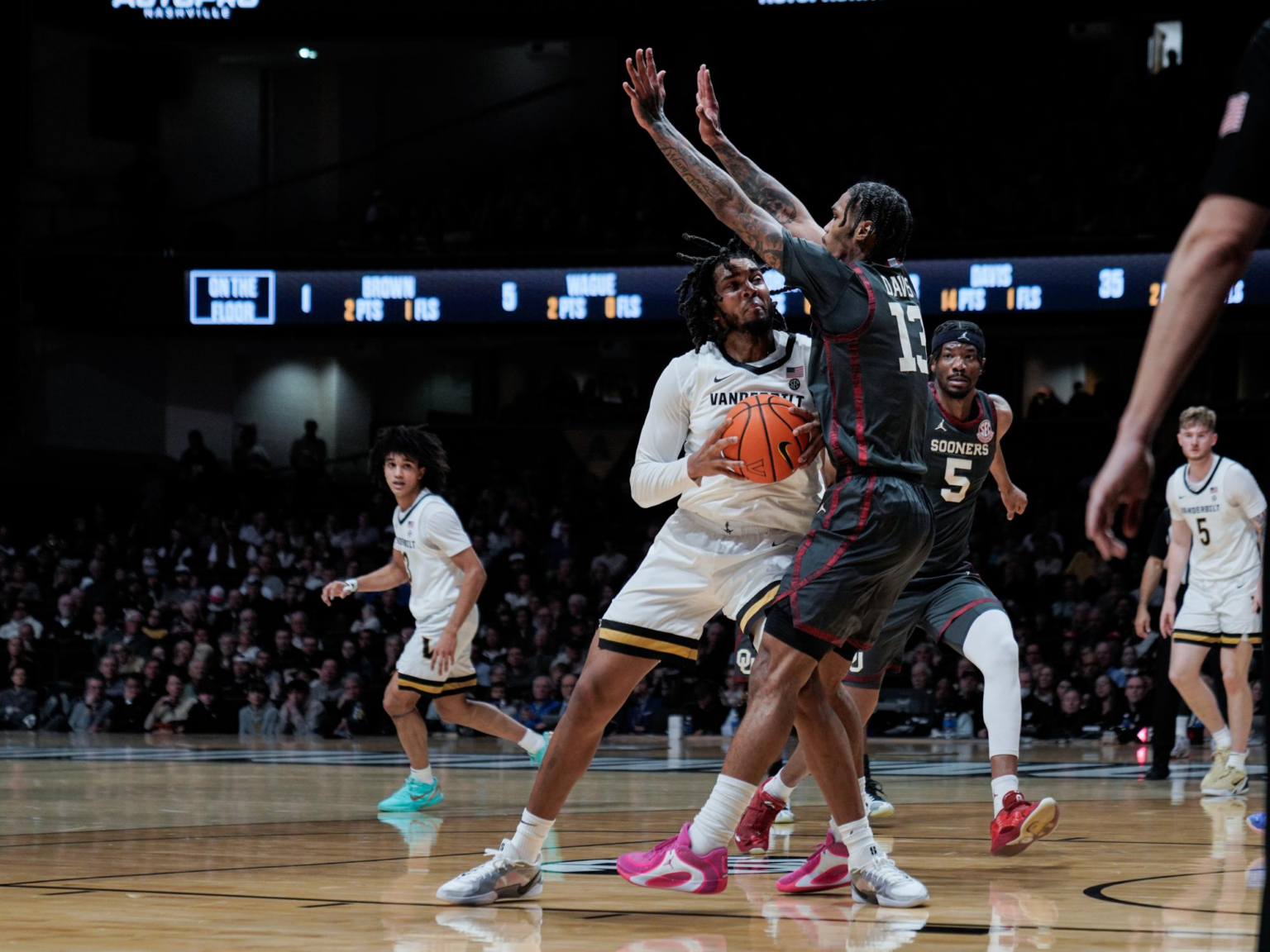Nickel hit the first field goal for Vanderbilt with a moving 3-point shot from the right wing, much to the crowd’s delight. Davis quickly got back a bucket for the Sooners, but an offensive rebound and dunk from Washington kept the lead to single digits. Davis, already with 11 points, finished through a foul from Nickel once again and hit the free throw to push the Sooners’ lead back to 10.