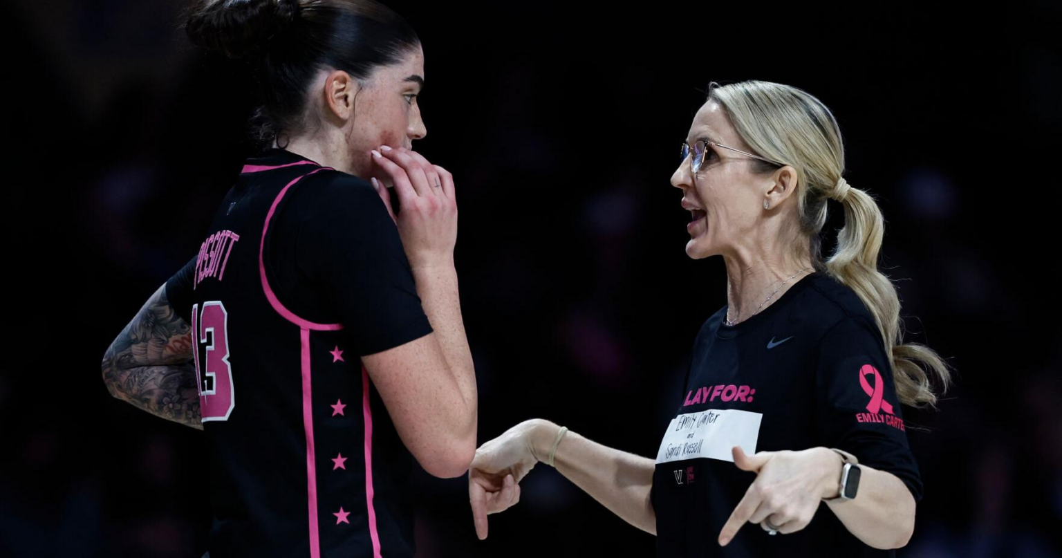 Vanderbilt head coach Shea Ralph, right, talks to Justine Pissott (13) during the second half of an NCAA college basketball game against Oklahoma, Monday, Feb. 9, 2026, in Nashville, Tenn.