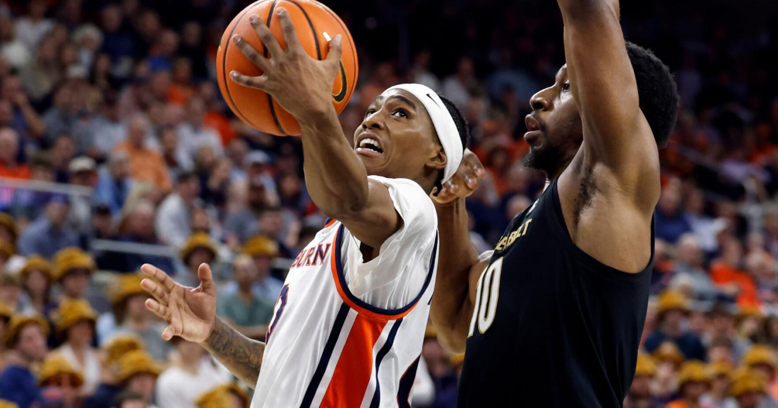 Auburn guard Tahaad Pettiford goes to the basket around Vanderbilt forward Ak Okereke (10) during the second half of an NCAA college basketball game, Tuesday, Feb. 10, 2026, in Auburn, Ala.
