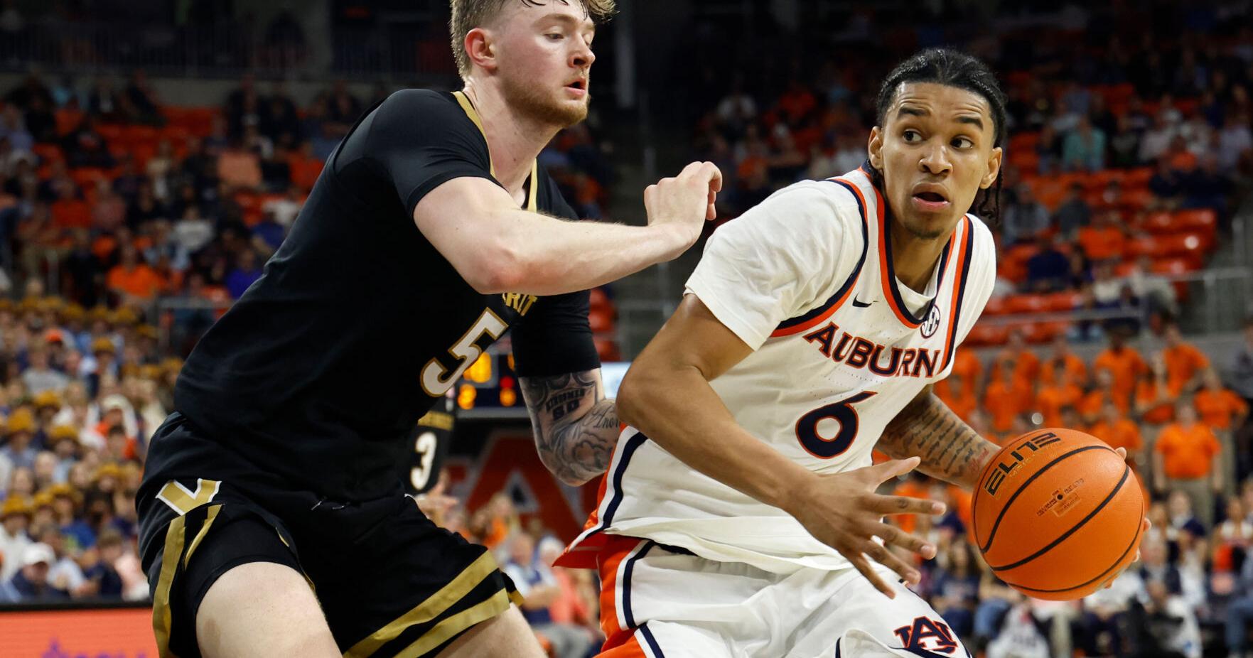 Auburn guard Elyjah Freeman (6) tries to get around Vanderbilt forward Tyler Nickel (5) as he goes to the basket during the second half of an NCAA college basketball game Tuesday, Feb. 10, 2026, in Auburn, Ala.