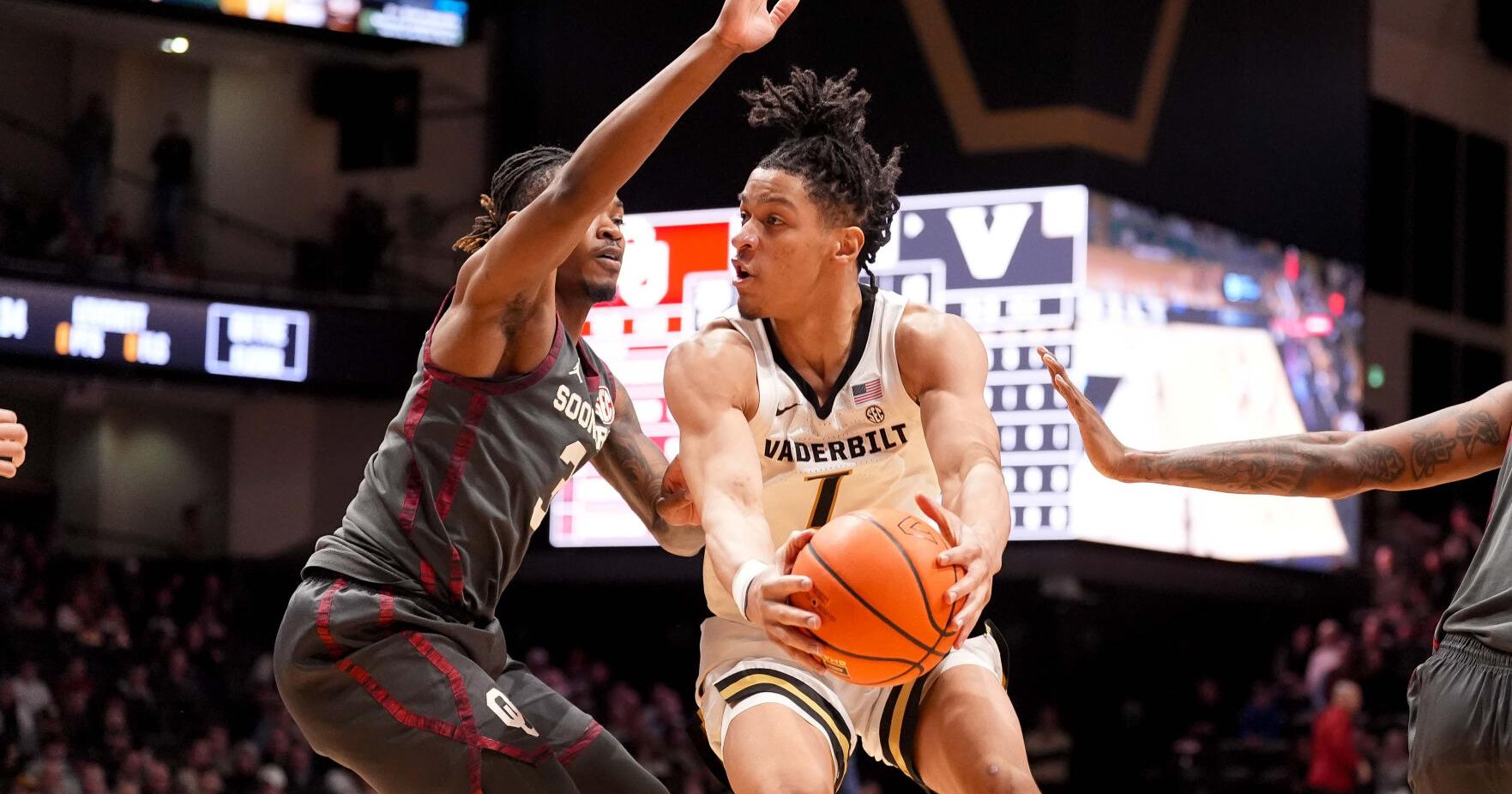 Vanderbilt guard Chandler Bing (7) grabs control of the ball against Oklahoma guard Jeff Nwankwo (3) during the second half of an NCAA college basketball game Saturday, Feb. 7, 2026, in Nashville, Tenn.