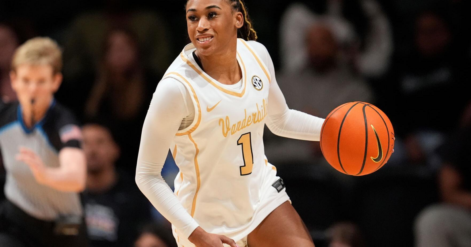 Vanderbilt guard Mikayla Blakes (1) plays during the second half of an NCAA college basketball game Thursday, Feb. 12, 2026, in Nashville, Tenn.