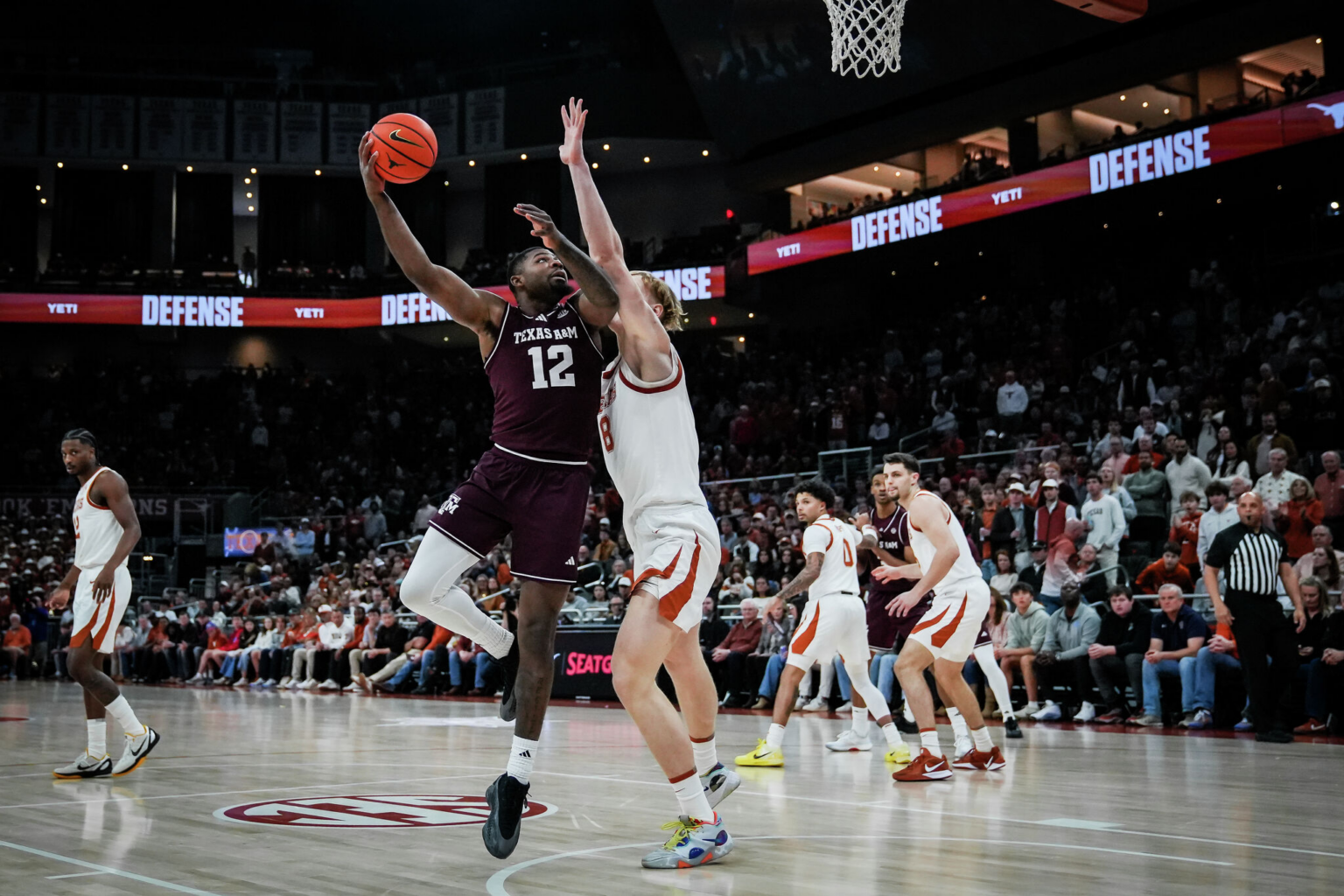 Texas A&M Aggies forward Rashaun Agee (12) puts the ball up over defense from Texas Longhorns center Matas Vokietaitis (8) during the first half of Lone Star Showdown, Jan. 17, 2026 at the Moody Center in Austin.