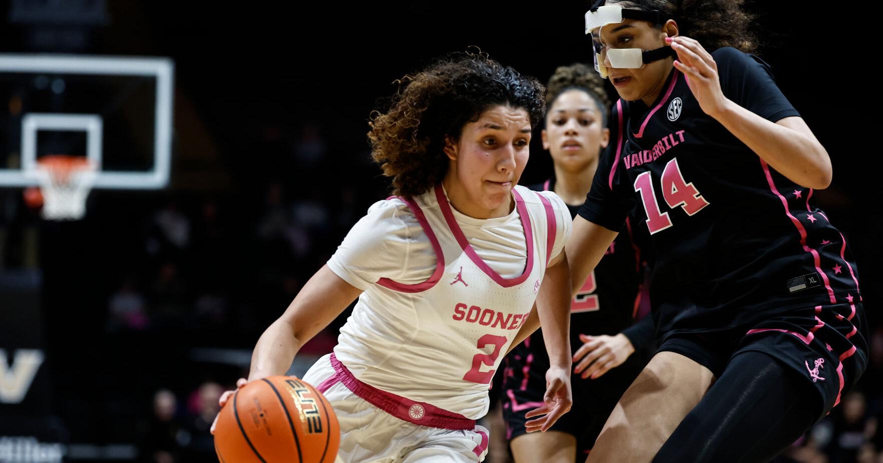 Oklahoma guard Aaliyah Chavez (2) drives against Vanderbilt forward Aiyana Mitchell (14) during the second half of an NCAA college basketball game Monday, Feb. 9, 2026, in Nashville, Tenn.