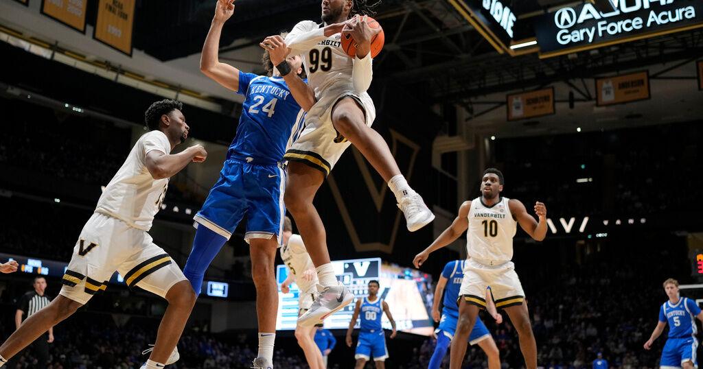Vanderbilt forward Devin McGlockton (99) rebounds the ball over Kentucky center Malachi Moreno (24) during the first half of an NCAA college basketball game Tuesday, Jan. 27, 2026, in Nashville, Tenn. (AP Photo/George Walker IV)