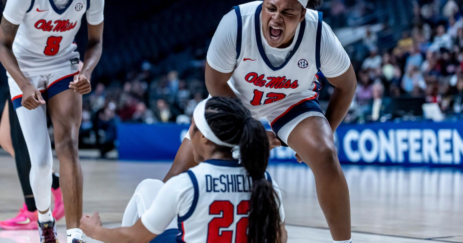Mississippi forward Christeen Iwuala (12) cheers her teammate, guard Denim DeShields (22), after a collision during the first half of an NCAA college basketball game against Vanderbilt, Friday, Jan. 30, 2026, in Birmingham, Ala.