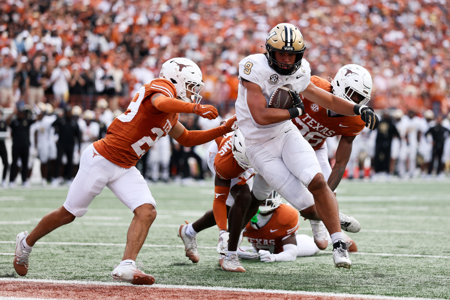 Diego Pavia is the one who drives this team. He finished the game 27 of 38 for 365 yards with 3 TDs through the air for his most prolific passing day in Black and Gold. He carried the ball 14 times for 43 yards and another score. His QBR was 85.0. In the first half, he was an efficient 14 of 18 for 153 yards. His 3rd quarter was a miserable 1 of 4 for 7 yards then he lit up the 4th quarter with 12 completions on 16 attempts and 205 yards. Outside of the fumble, he had a pretty good day. Frankly, he should have had the ball in his hands sooner, especially on rollouts and other stuff to the perimeter. Texas’s pass rushers off the edges were causing problems, but the rollouts neutralized them quite a bit while giving Pavia escape routes. It was his 2nd time throwing for more than 300 yards as a Commodore, and those two games were the only ones with more than 270 yards passing in his 2 seasons on West End.