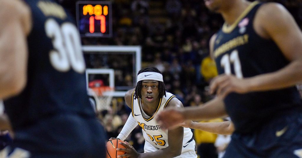 Mizzou then-junior Mark Mitchell holds the ball while looking to attack against Vanderbilt on Jan. 11, 2025, at Mizzou Arena in Columbia. Mitchell and the Tigers are back in action against the Commodores in a game that could help MU’s tournament hopes at 8 p.m. Wednesday.