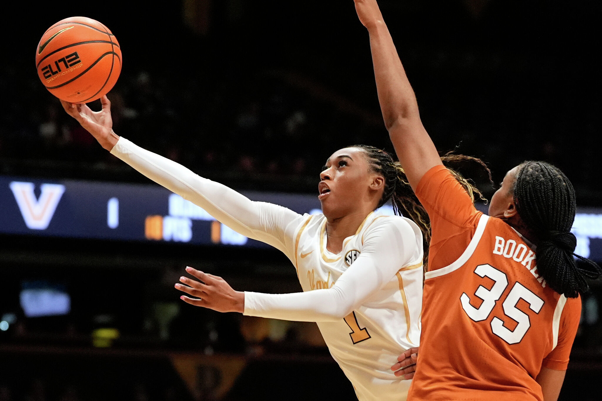 Vanderbilt guard Mikayla Blakes (1) shoots the ball near Texas forward Madison Booker (35) during the second half Feb. 12, 2026, in Nashville, Tenn.