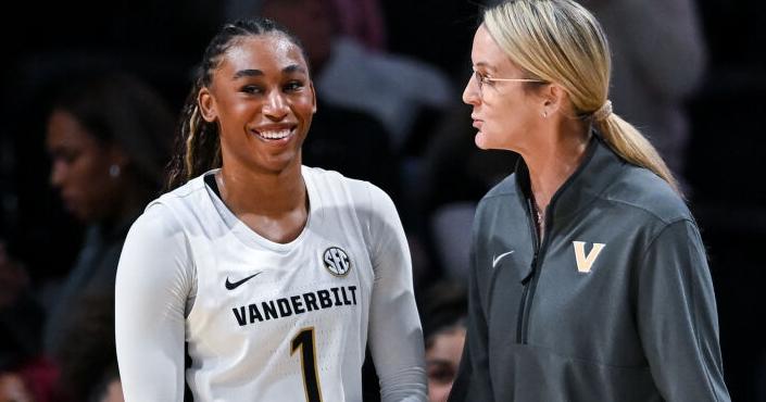 Mikayla Blakes and head coach Shea Ralph of the Vanderbilt Commodores are seen during the first half of a basketball game with the Furman Paladins at Memorial Gymnasium on Nov. 10, 2025.