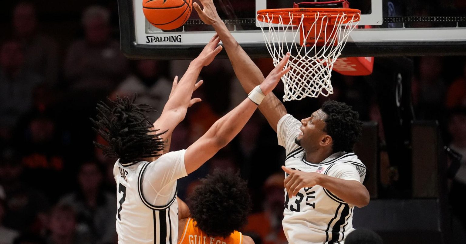 Vanderbilt center Jalen Washington (13) and guard Chandler Bing (7) block a shot by Tennessee guard Ja’kobi Gillespie (0) during the second half of an NCAA college basketball game Saturday, Feb. 21, 2026, in Nashville, Tenn.