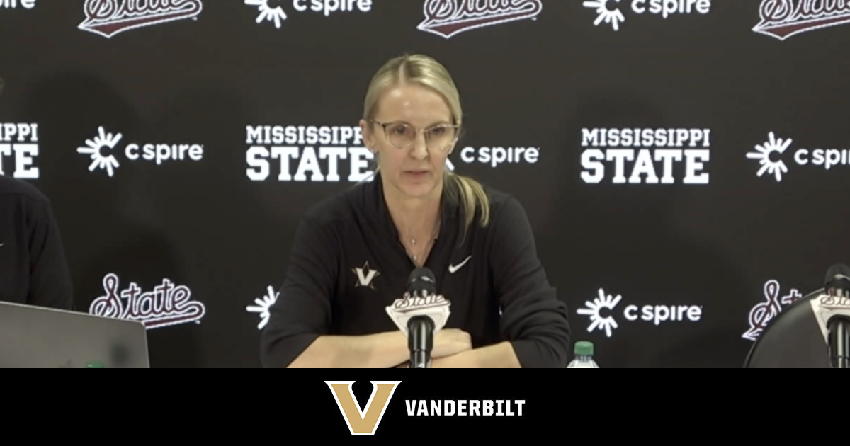 Vanderbilt women's basketball head coach Shea Ralph talks to the media after an 89-84 victory at Mississippi State to move to 18-0