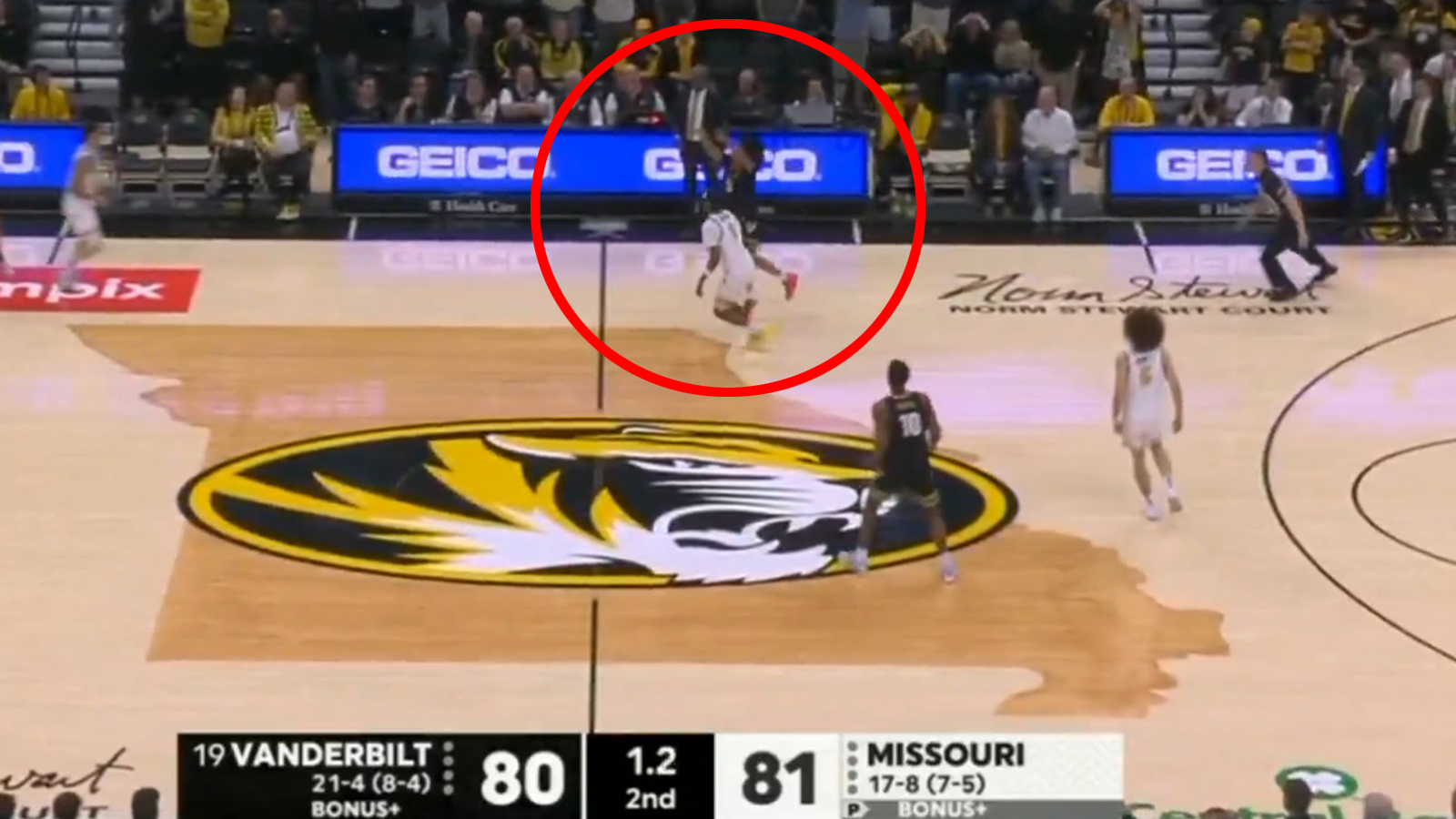 Vanderbilt sophomore guard Tyler Tanner intercepted a bad inbound pass by Missouri senior guard Mark Mitchell near the half-court line. Tanner immediately fired a desperation heave, which nearly went in.